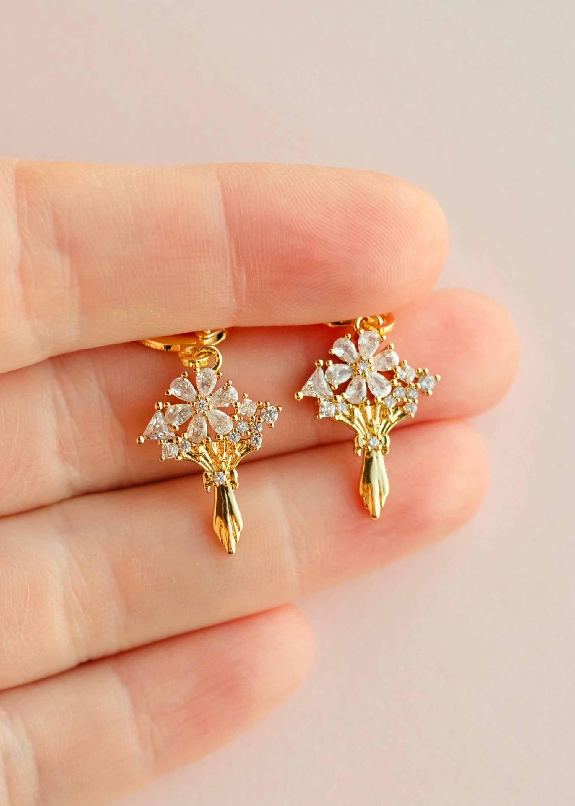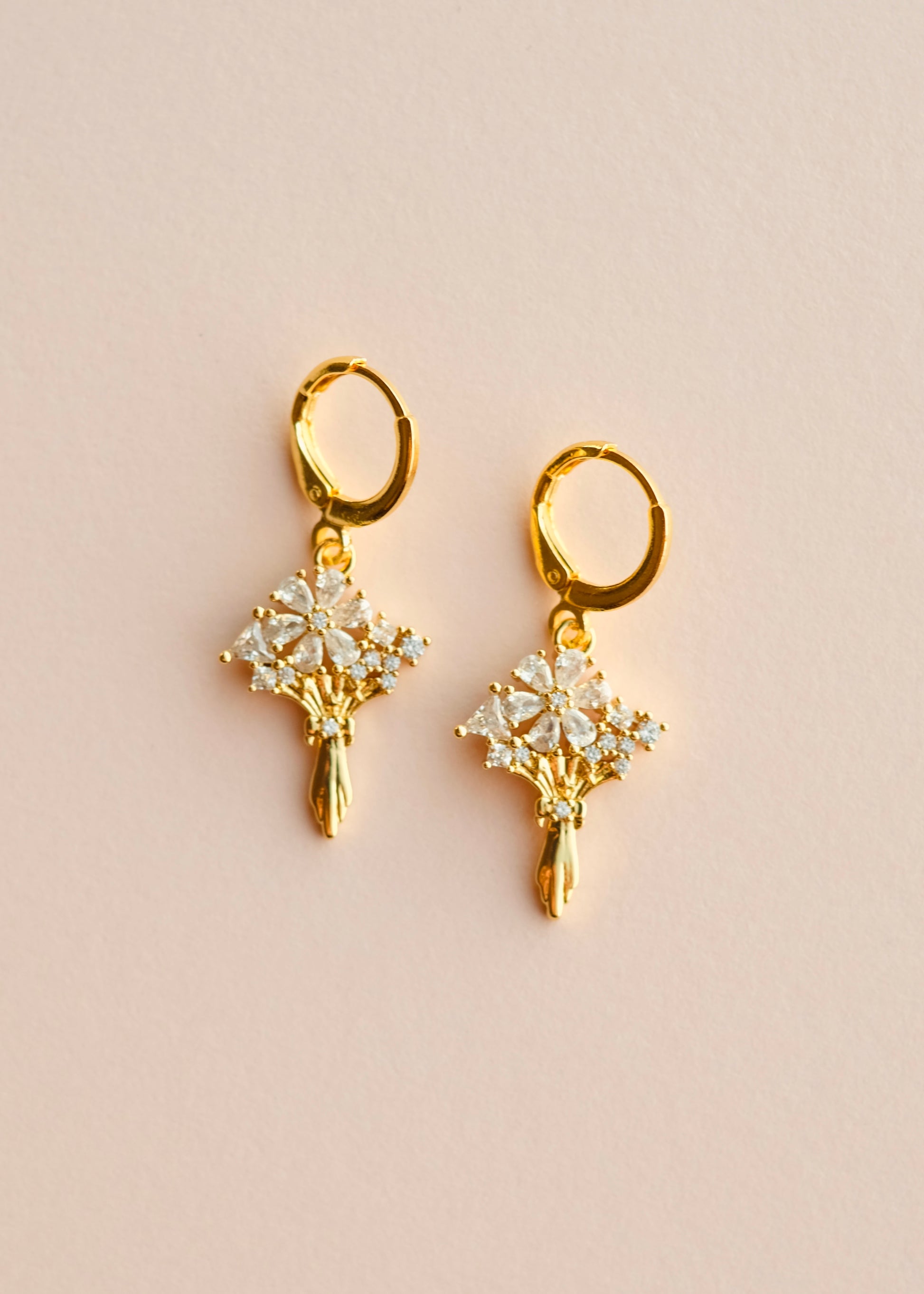∴ Gold-plated zirconia bouquet charms on gold-plated huggies. Gold-filled or sterling silver hardware available for upgrade, as well as free swaps and clip-on options under Upgrades & Swaps.