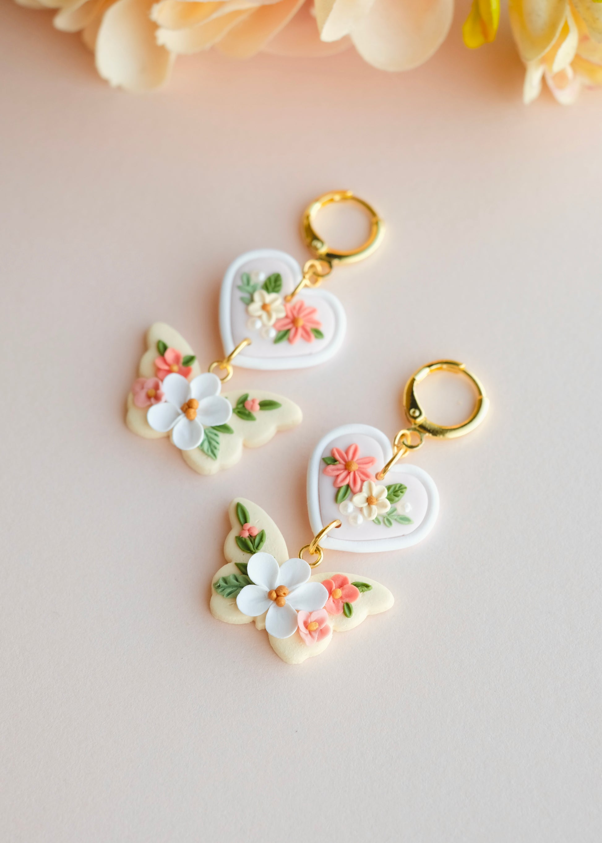 ∴ Hand-sculpted flowers surrounded by faux pearls on gold-plated huggies. Gold-filled or sterling silver hardware available for upgrade, as well as free swaps and clip-on options under Upgrades & Swaps.