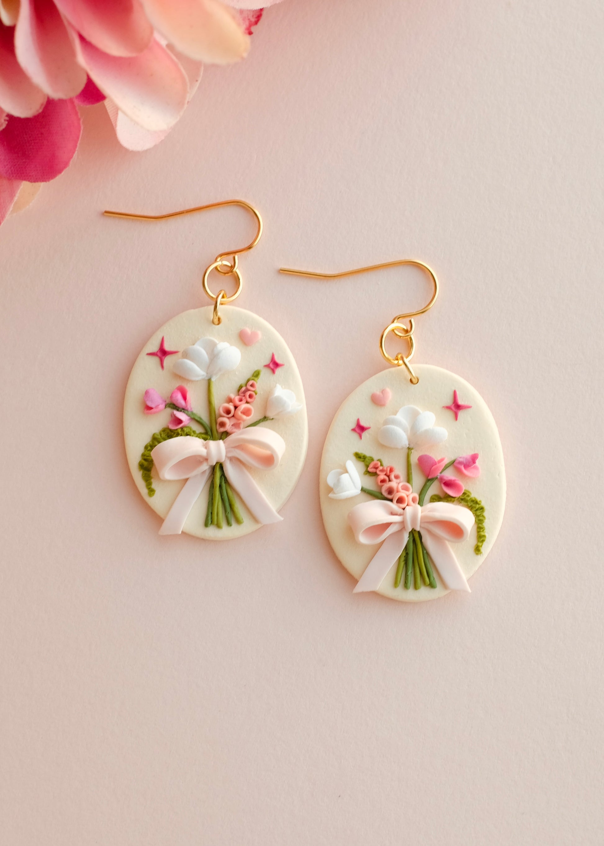 ∴ Gold-plated French hooks. Gold-filled or sterling silver hardware available for upgrade, as well as free swaps and clip-on options under Upgrades & Swaps.